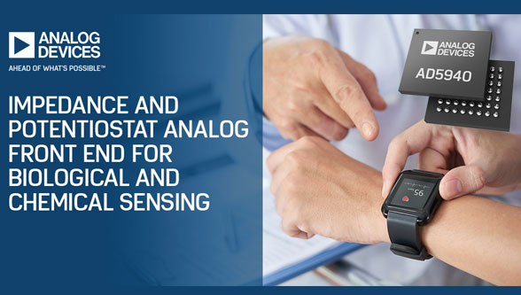 Analog Devices, Inc. announced recently a new electrochemical & impedance measurement front end that enables the next generation of vital sign monitoring devices and intelligent electrochemical sensors. The AD5940 analog front end incorporates both potentiostat and electrochemical impedance spectroscopy (EIS) functionality on a single chip, allowing for sensor measurement in both time and frequency domains. The device features integrated hardware accelerators for advanced sensor diagnostics, best-in-class low noise for accurate sensor measurements and is designed for wearable “always-on” applications. Compared to traditional discrete solutions which pose limitations and require multiple ICs to achieve similar performance, ADI’s single chip solution offers advantages in terms of system accuracy and size flexibility to measure 2-Lead, 3-Lead and 4-Lead electrochemical sensors. It’s an ideal solution for applications, where high precision biological and chemical sensing is mission-critical, such as industrial gas sensing, liquid analysis, material sensing, vital signs monitoring, impedance spectroscopy and disease management.