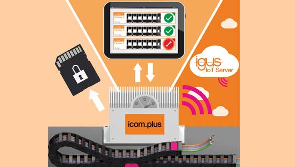 Under the name isense, igus carries sensors of various kinds that detect the condition of igus components such as cables or energy chains. They measure among other things the wear during the operation and alert the user early enough to plan repair or replacement. By networking with the icom communication module, the data is transmitted to an intelligent system. The module can be connected to all igus specific sensors. For example, with sensors for the measurement of abrasion, or the wear measurement of the pin-bore connection of the energy chain, as well as sensors for the detection of break and push-pull forces and for cable monitoring. Once the measured values from a sensor have been transferred to the icom module, they have to be “interpreted”, i.e. understood in order to generate instructions from the same. So far, this has been possible via the connection to the igus cloud. Due to the increasing importance of IT security, however, many companies are increasingly relying on the development of their own SCADA systems, which is why igus has now advanced its data concentrator into icom.plus. With the new module, the customer can integrate the data in the way that best suits their equipment.