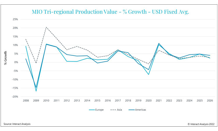 New research from Interact Analysis shows that the pandemic has had marked effects on the manufacturing industry. Whilst many machinery sectors are enjoying double-digit growth, other areas continue to suffer due to supply chain issues and chip shortages. Output growth of 8.3% in 2021 has been recorded as manufacturing recovers from the pandemic. And while this is dwarfed by the 16% manufacturing output growth seen in 2010 after the financial crash, it is not so unexpected. That’s because the last crash saw manufacturing shrink by 8.3% in 2009. In contrast, 2021 saw decline of only 3.2%.