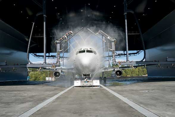 The de-icing of aircraft is expensive and time-consuming, since multiple steps here still require manual intervention. As many aircraft have to be freed of ice simultaneously, the de-icing becomes the bottleneck at the airport. The same situation applies to cleaning. The washing of a Boeing 737 takes place manually – and that can take up to ten hours. MSG Production AS took on these challenges and for the first time developed a stationary, fully automatic system, which fulfils two purposes: de-icing and washing. It reduces the de-icing time to seven minutes and the washing time to twenty minutes. The system consists of three beams, attached to each of which are two telescopic arms and bars. There is a nozzle system in the bars and on the floor. When an aircraft enters the hangar, it is pulled by an electric carriage and cleaned or de-iced by the system similar to that in a car wash. Since this must work reliably despite humidity, chemicals and cold, the manufacturer makes special demands on the system components. The developers therefore rely on energy chains from igus for safe guidance of hoses and cables.
