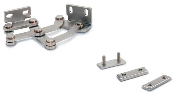 The Stainless Steel-Multiple-joint hinges are made up of fixing angle pieces, which are mounted on the housing or the door, and an intervening 7-speed, clearance-free, self-lubricated joint mechanism. Thanks to the movement of the joint mechanism designed by simulation software, when opening, for example, a flap is first slightly lifted and then swung by 180°. Maximum flexibility in installation: Long holes in the mounting bracket and spacer plates make the hinge adjustable on three levels. For easy mounting, threaded plates and spacer plates are available as accessories.