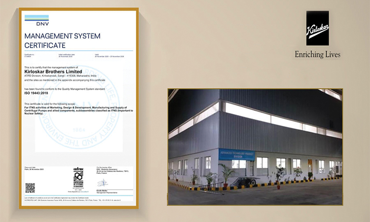 Kirloskar Brothers Limited’s (KBL) Advanced Technology Product Division (ATPD) at Kirloskarvadi has achieved ISO 19443 certification, reaffirming the company’s commitment to the highest standards of quality, safety and reliability for the nuclear sector. This globally recognised certification applies to Important To Nuclear Safety (ITNS) activities related to marketing, design and development, manufacturing and supply of centrifugal pumps and allied components, sub/assemblies classified as ITNS.