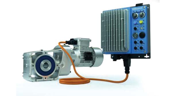 LogiDrive drive units comprise an IE4 synchronous motor with rated powers of up to 5.5 kW, a 2-stage helical bevel gear unit and a frequency inverter which is installed close to the motor. The inverter is equipped with a mains switch, a key switch to isolate the drive unit from the system controller and a direction selector switch for local installation mode.