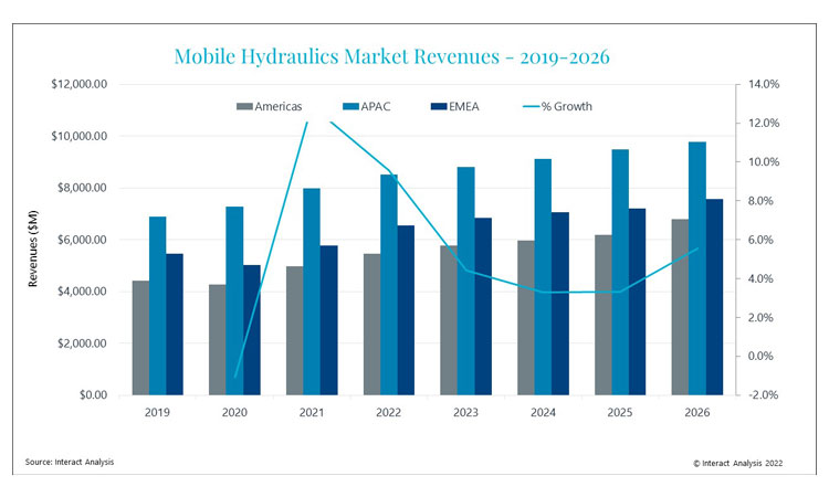 Updated research from Interact Analysis shows that despite a slight contraction in 2020, the mobile hydraulics market did well in 2021, hitting $18.7bn in terms of revenues. In total, between 2019 and 2021, the market grew with a CAGR of 5.2%. Mostly, this strong growth was due to a boom in the material handling market and increased demand for construction equipment. It is expected that new hydraulic technologies such as digital and electro hydraulics will improve hydraulic efficiency, an important consideration in the wider context of vehicle electrification.