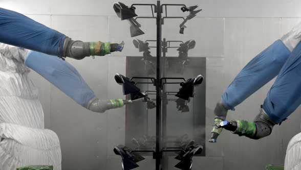 A typical painting system consists of several stations for sequential operation. The process starts with flaming the work piece, followed by the application of several coatings: first a primer, then a base coat and finally a clear coat. Coating itself is done by application robots without any human intervention. These robots are programmed in a way to guarantee application of the required coats with an absolutely even thickness. Paint supply of the robots is handled from a central paint preparation section, where the required coating materials as well as flushing agents to clean the nozzles are provided. Besides an engineering station, several industry PCs are used to control both process technology and material transport technology. They are assigned to each of the application stations for flaming, primer, base coat and clear coat. At process control level, b+m surface systems relies on Beckhoff IPCs, while RH04.0 Bosch-Rexroth robot controllers are employed at field level. Communications between both levels is accomplished via a CAN interface. An integrated CAN/CAN gateway connects the external CAN bus to the IPCs of the internal CAN bus with the individual robot controllers.
