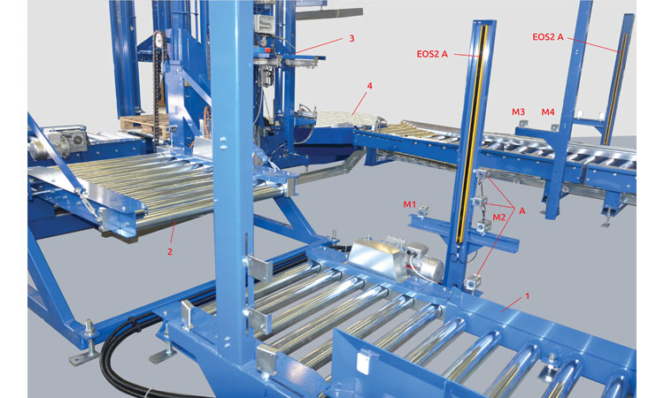 - In order to protect the box entrance, the dangerous area of the machine, before the lift 2, there is an EOS2 A safety light curtain with 90 mm resolution and bidirectional muting (input and output). Two photocells M1 and M2 are used as muting sensors.