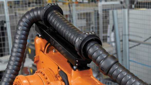 Industrial robots for assembling vehicle parts in the automotive industry, for example, work with high rotations and many fast movements. Users rely on energy chains to ensure that cables for data, pneumatic and energy supply are safely guided on the robot. The triflex R e-chains from igus are very useful here because they are specially designed for industrial robotics and adapt to the three-dimensional movements of robots. However, with the growing diversity in automated production technology, it is necessary to guide not only electrical and pneumatic cables, but also hoses for bolts, rivets and screws. Since these hoses are not compatible with tight bend radii, a retraction system is required for the energy supply of the robot. For this reason igus has now developed a new, very cost-effective retraction system triflex RSEL for its energy chains. This ensures that the e-chain is kept as compact as possible on the robot arm. The system prevents the hanging energy supply system from affecting or blocking the movements of the robot, even in highly dynamic applications. In the worst case, looping would damage the energy chain, the cables and hoses inside it, leading to machine failure.