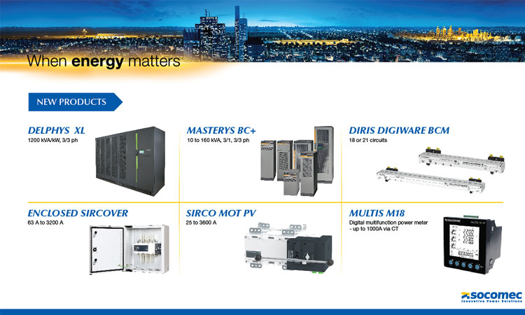 SOCOMEC has also introduced the Masterys BC+ UPS 10-20kVA with unity power factor, as well as a variety of power monitoring products such as the Diris Digiware BCM, a multi-circuit current measurement module with 18 or 21 integrated sensors, and the Multis M18 panel-mounted Digital Multifunction Power Meter. On the Power Switching solutions, SOCOMEC has showcased SIRCO MOT PV, Motorised load break switches ranging from 250 to 3600 A, up to 1500 VDC, Enclosed Manual Transfer Switches ranging from 63 A to 3200 A to ensure the safe on-load transfer between two sources.